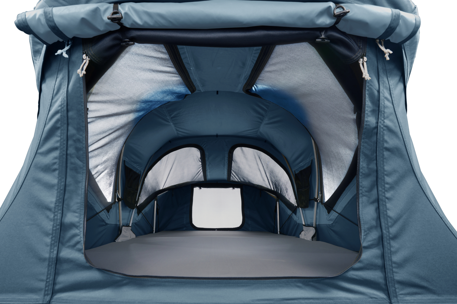 Vårt prisbelönta tak-tält är nu ännu mer bekvämt. Den vinklade stegen låter dig klättra in med en stabil och naturlig rörelse. Inuti förvandlar det mjuka quiltade madrassöverdraget tältet till en mysig tillflyktsort. Inbyggd kompatibilitet för värmeport säkerställer komfort i både kalla och varma klimat.