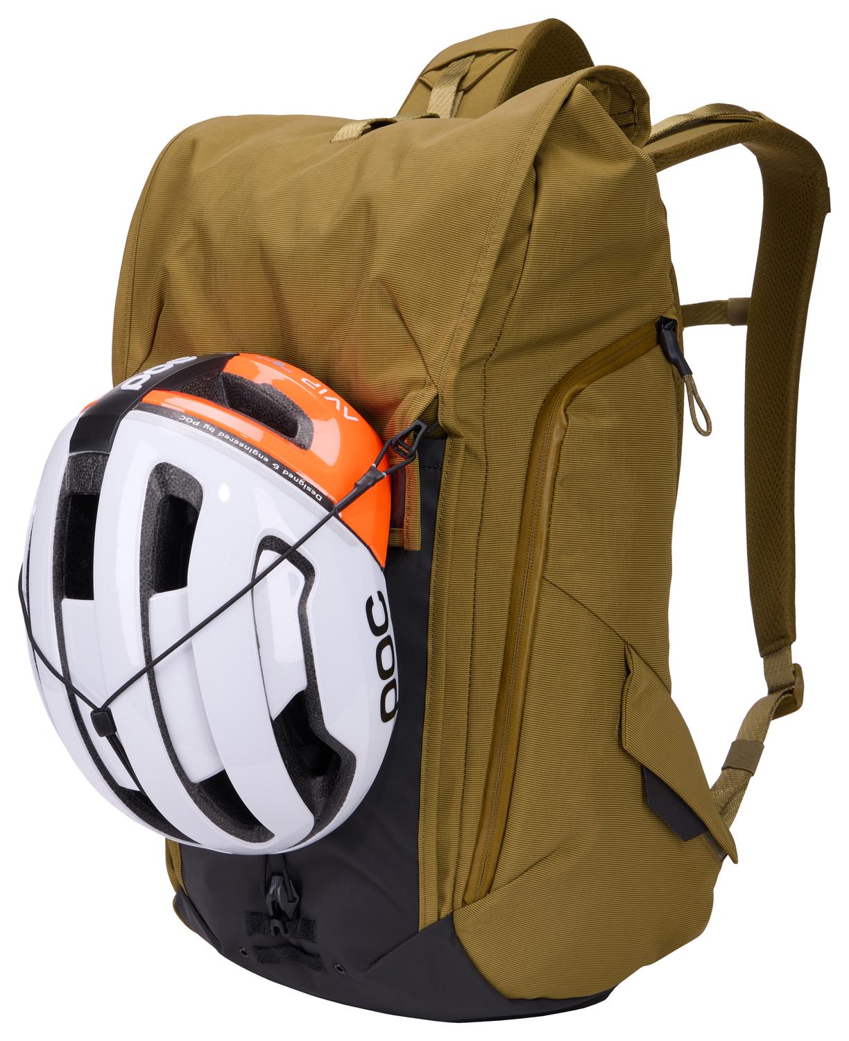 - Fäst hjälmen genom säkerhetslinan på väskans framsida för handsfree-transport när du inte cyklar. Ta enkelt av och förvara den för en strömlinjeformad estetik