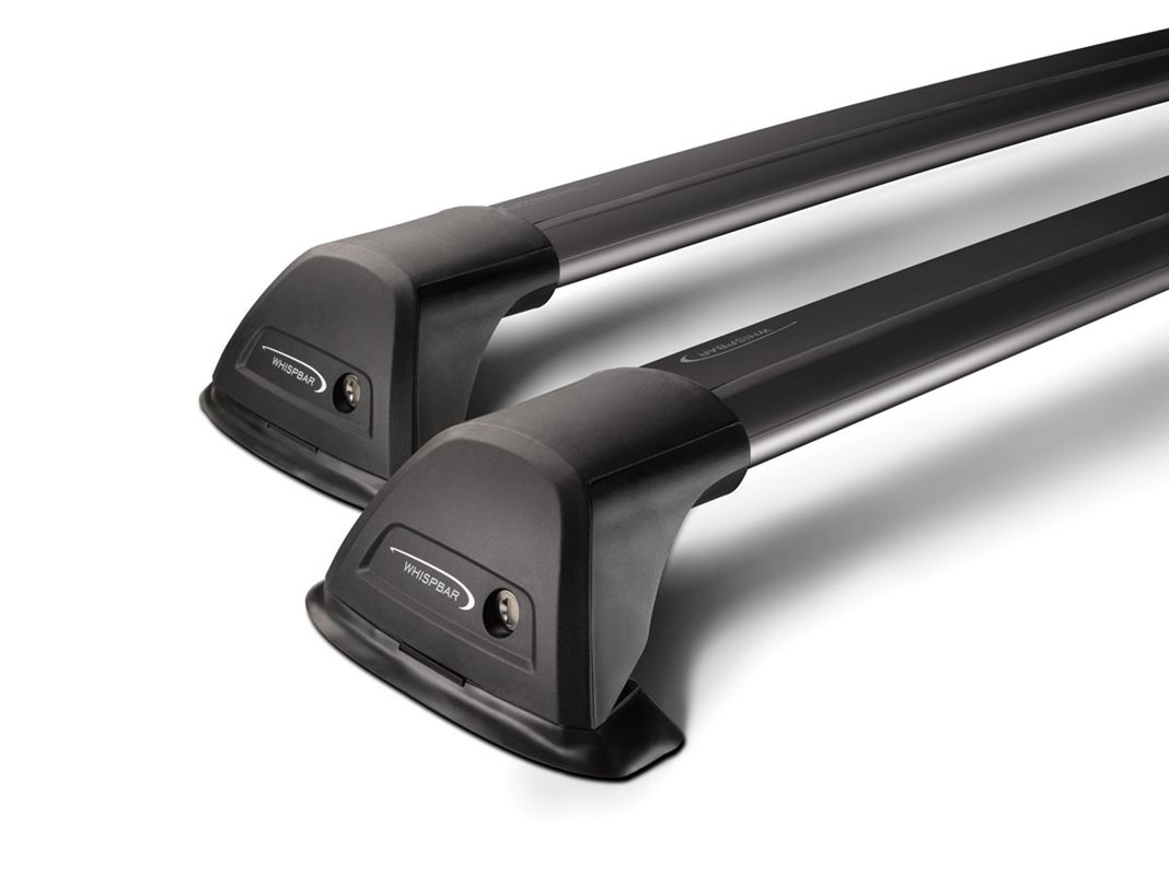 Vingformad profil i svartlackerad aluminium. Yakima Flushbar sticker inte ut på sidorna utan avrundas mjukt vid fästpunkterna på biltaket. De är låga och integreras fint med bilkarossen.